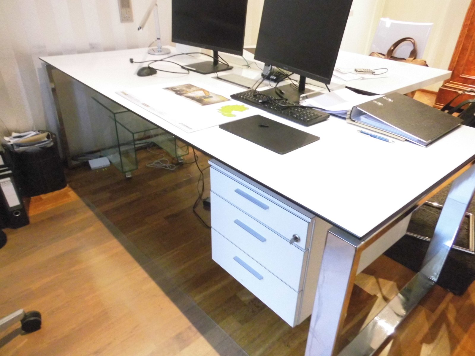 1 Stück Schreibtisch weiß mit Chromgestell, Breite ca. 2 mtr